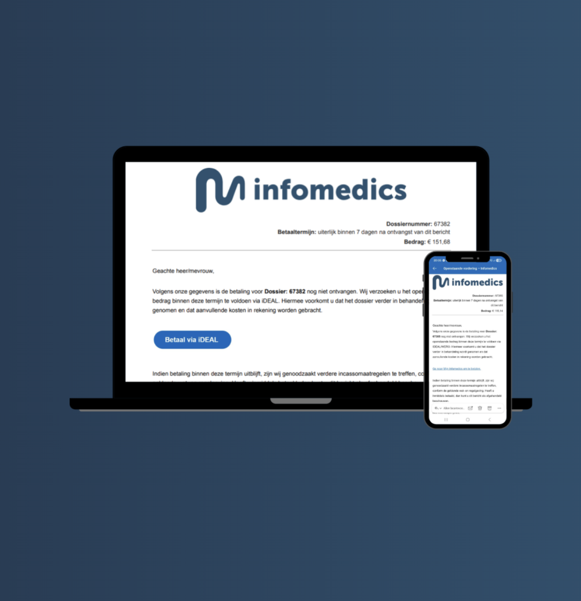 Op dit moment gaan er meerdere e-mails rond met de melding dat er een betaling niet is ontvangen. Belangrijk: er is géén datalek geweest bij Infomedics. Internetcriminelen kopen lijsten met e-mailadressen op, en sturen e-mails die lijken op die van ons. De e-mail die nu rondgaat heeft de titel: ‘Openstaande vordering – Infomedics’ en wordt gevraagd om € 115,14, € 151,68 of € 157,68 te betalen onder dossiernummer 67382 of 67385. Klik niet op de link, doe geen betaling en verwijder de e-mail.